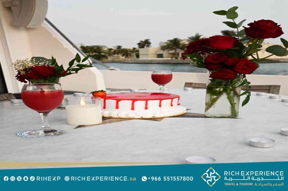 رحلة رومانسية على أضواء الشموع لشخصين مع مضيفة خاصة ، تشمل عشاء فاخر وتجهيزات اليخت بالورد والضيافة